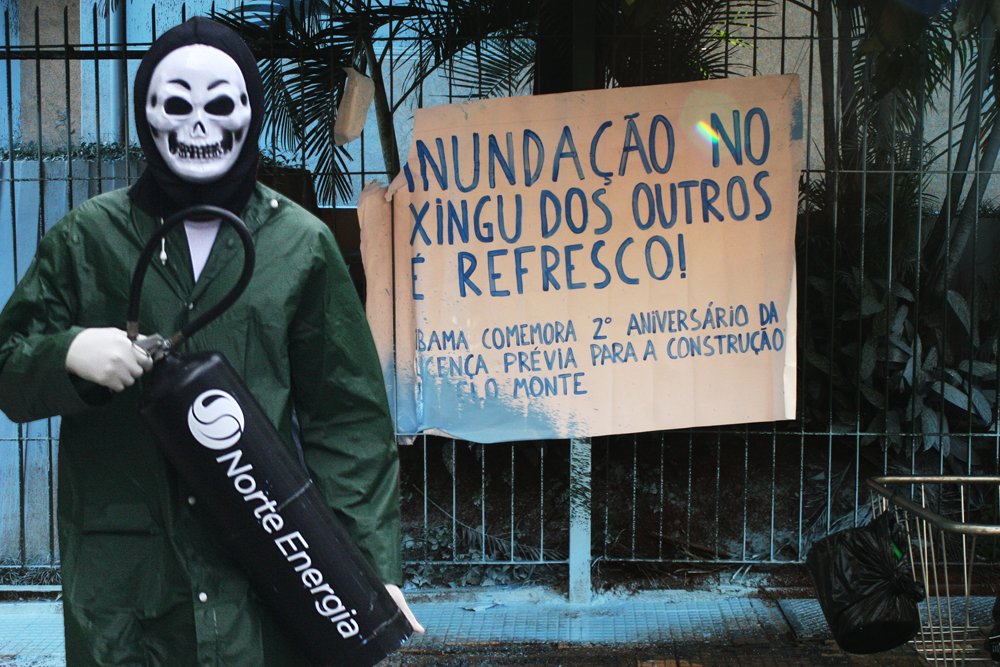 Em São Paulo, a fachada do edifício foi inteiramente pintada com jatos de tinta azul, simbolizando o alagamento da entidade e peixes pobres jogados em seu jardim. No portão foi afixada uma faixa com os dizeres: “Inundação no Xingu dos outros é refresco”.