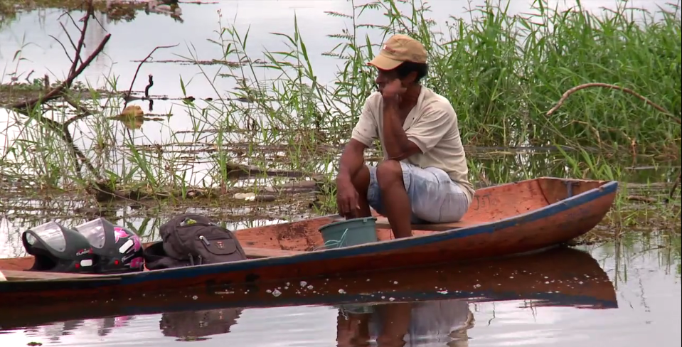 Quatro segundos, aos 16:26 minutos: é o tempo que aparece a imagem acima. Um pescador, rosto apoiado sobre o punho fechado, em sua canoa paralisada em um Xingu em agonia. Entre a vegetação boia lixo, e ao lado da embarcação, bolhas que apontam problemas de oxigenação da água.