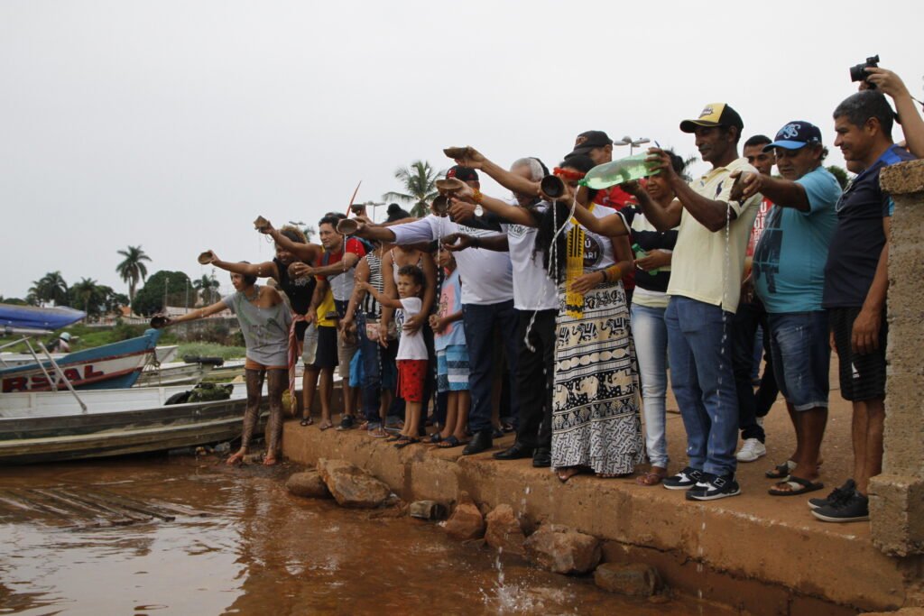 Lideranças comunitárias do Xingu e de outras bacias hidrográficas do Pará despejam água de seus rios na orla de Altamira para simbolizar uma nova aliança construida a partir das águas